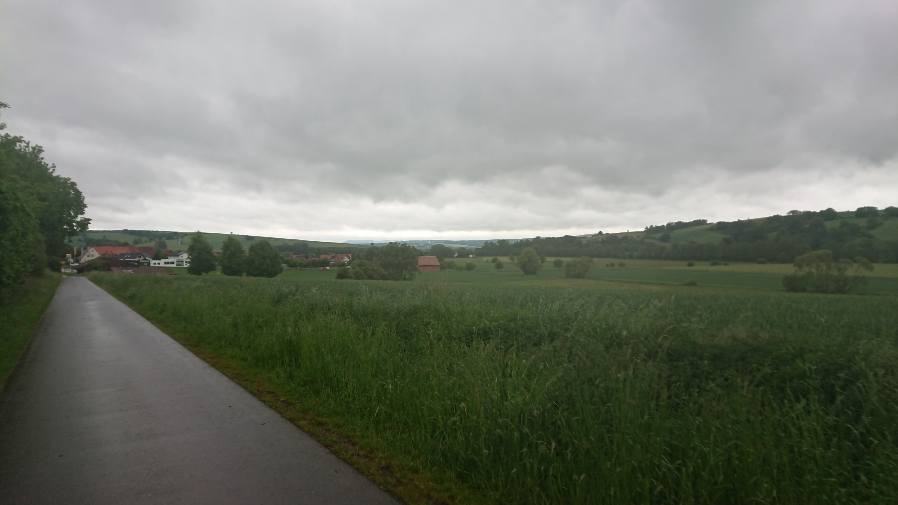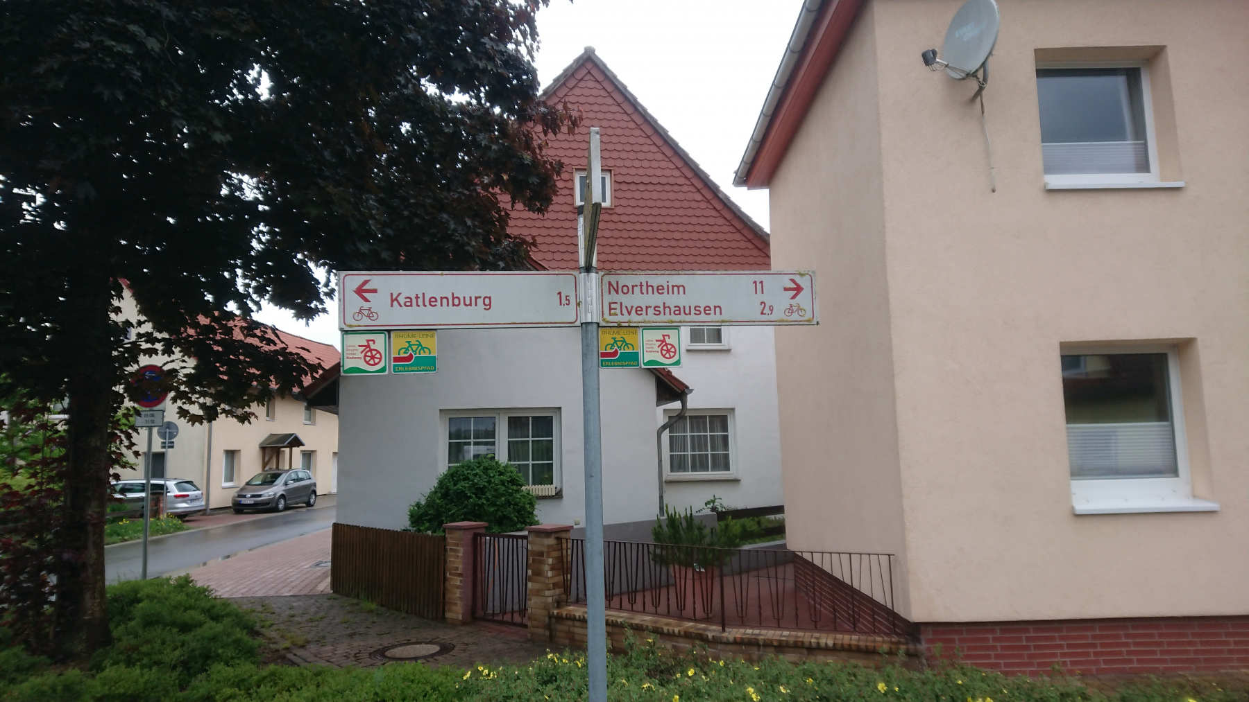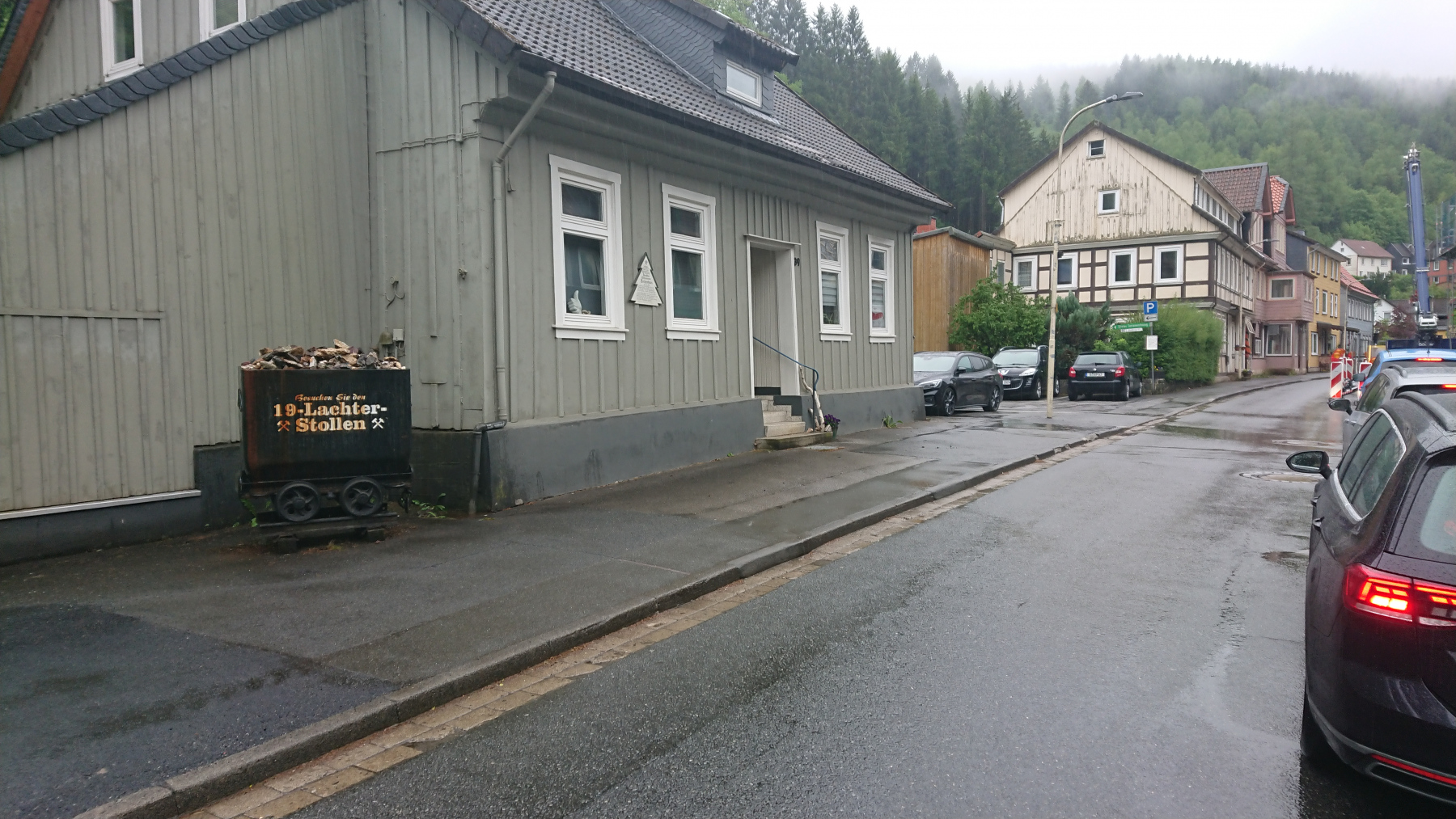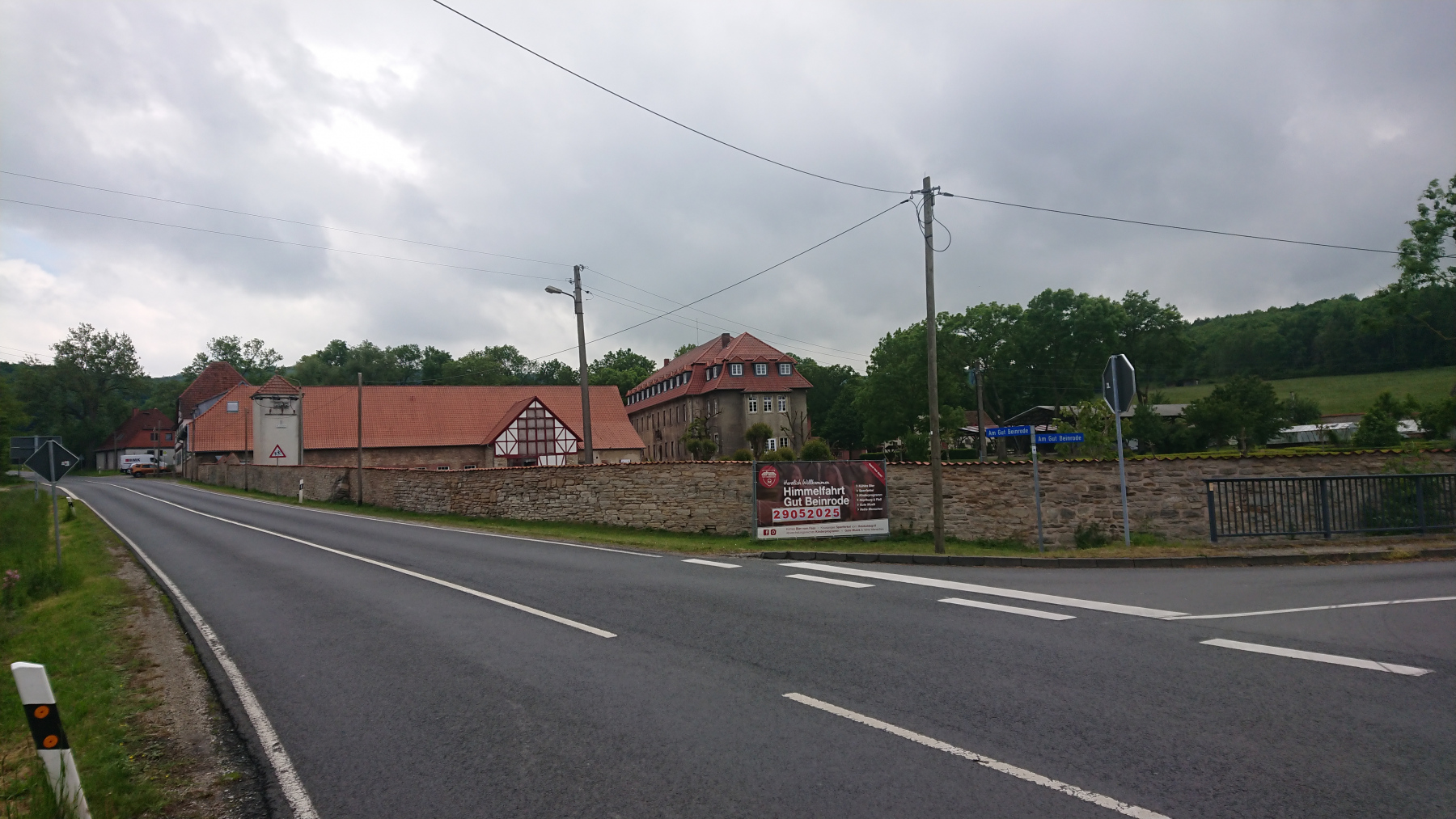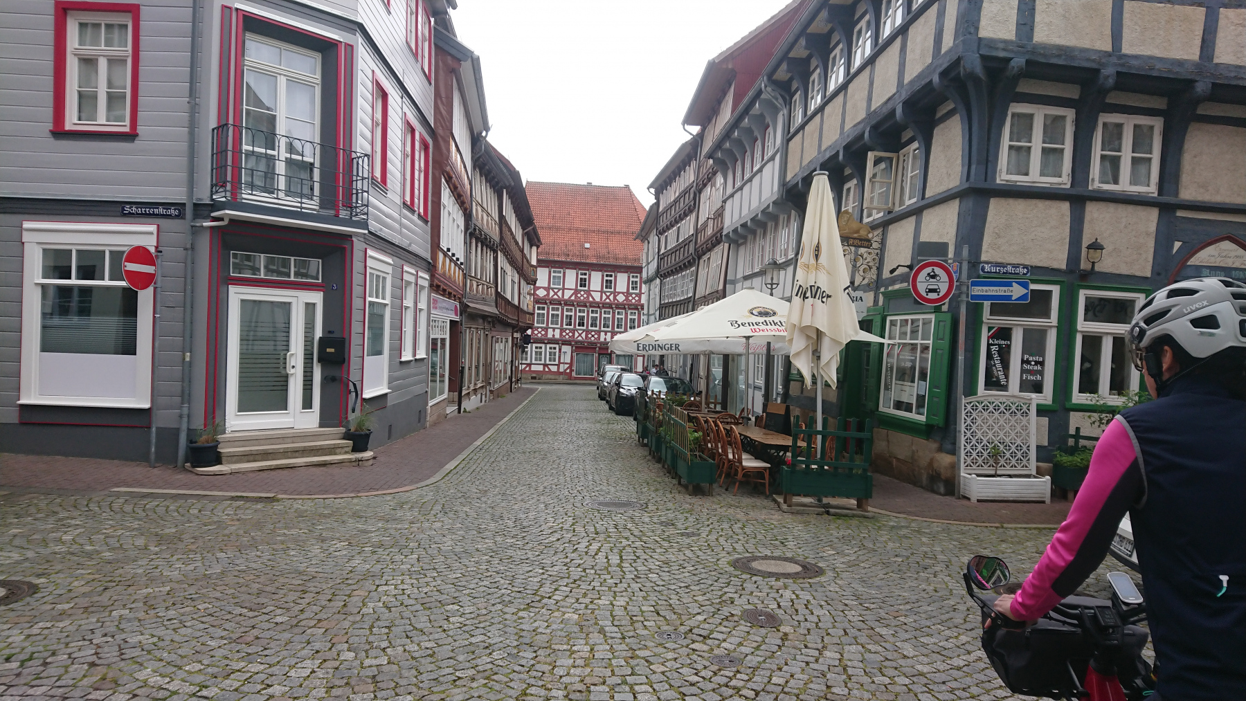 Durch Bad Grund und Windhausen fahren wir wieder aus dem Harz hinaus. Bergab bei Regen ist auch nicht grad toll. Man kann das Gefälle nicht in Geschwindigkeit umsetzen, sieht nur wenig, ständig läuft einem Wasser in die Augen und bremsen sollte man mit viel Gefühl.