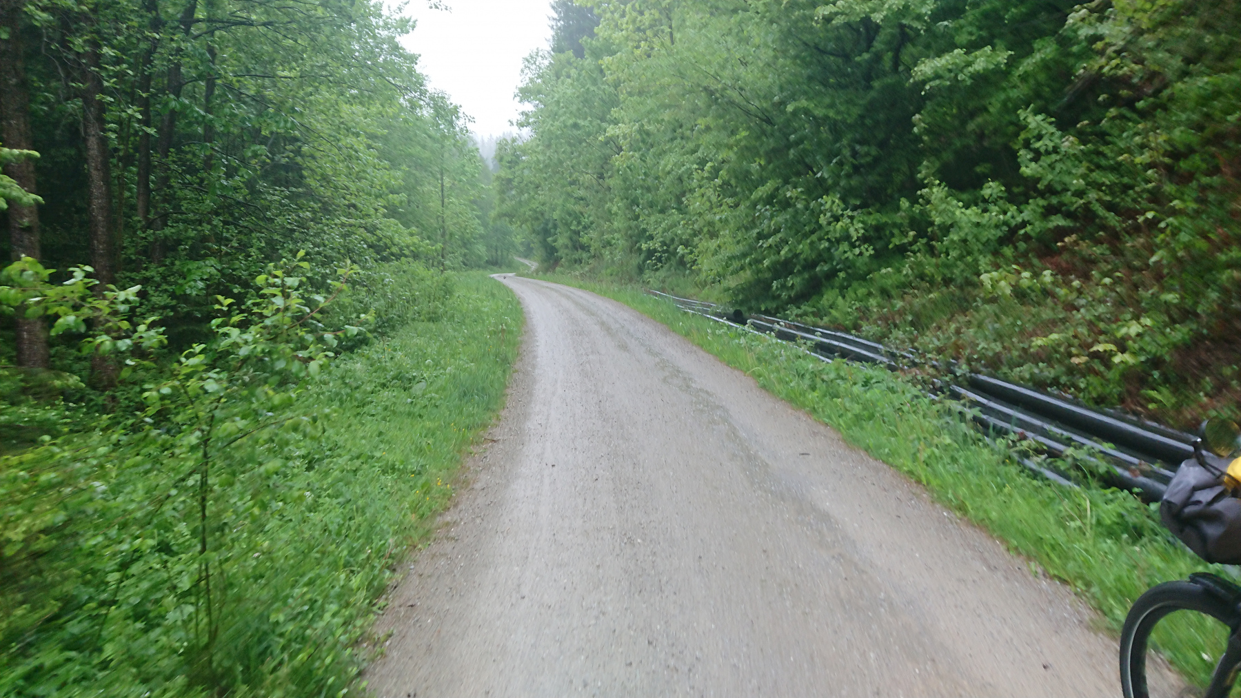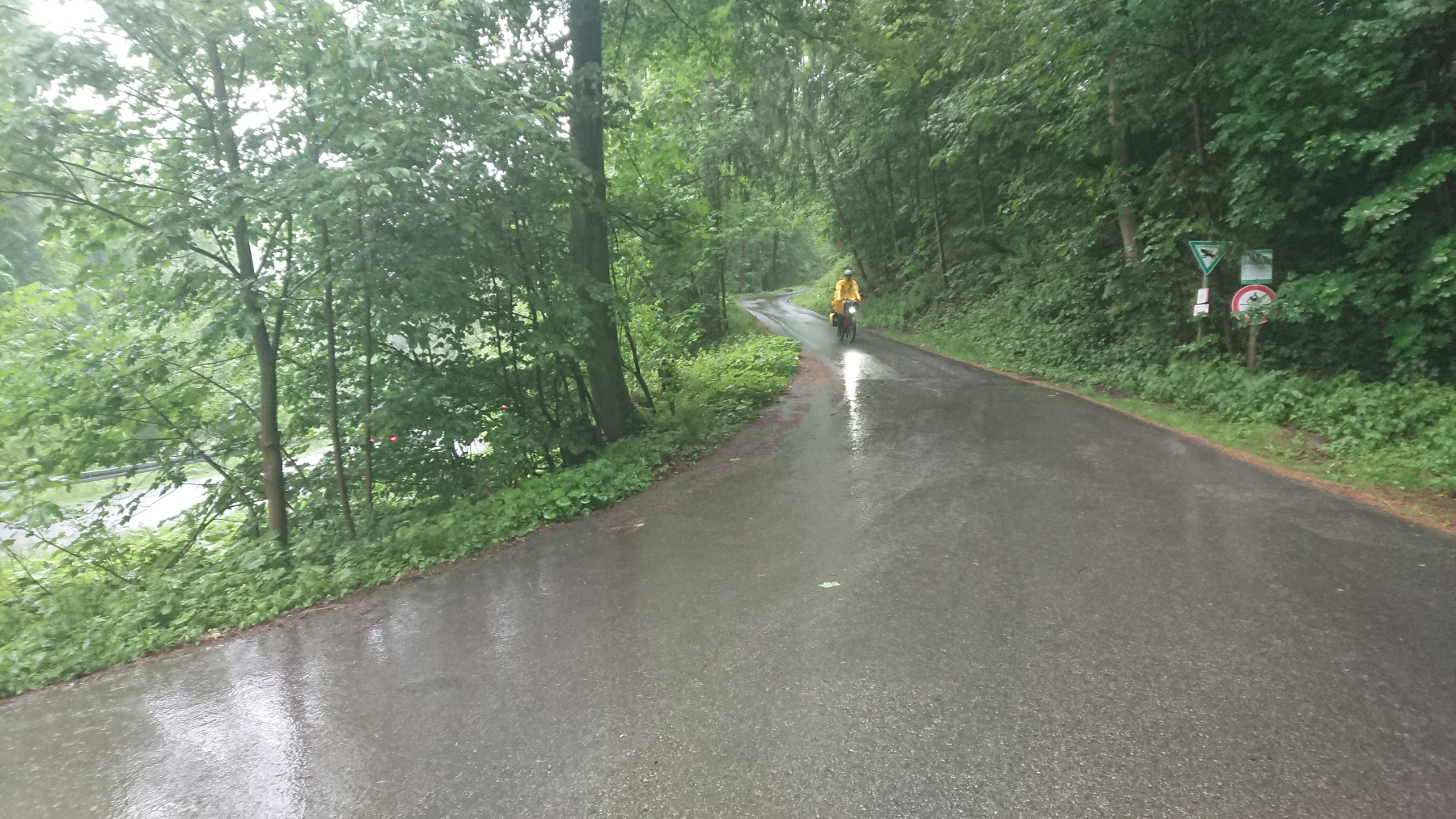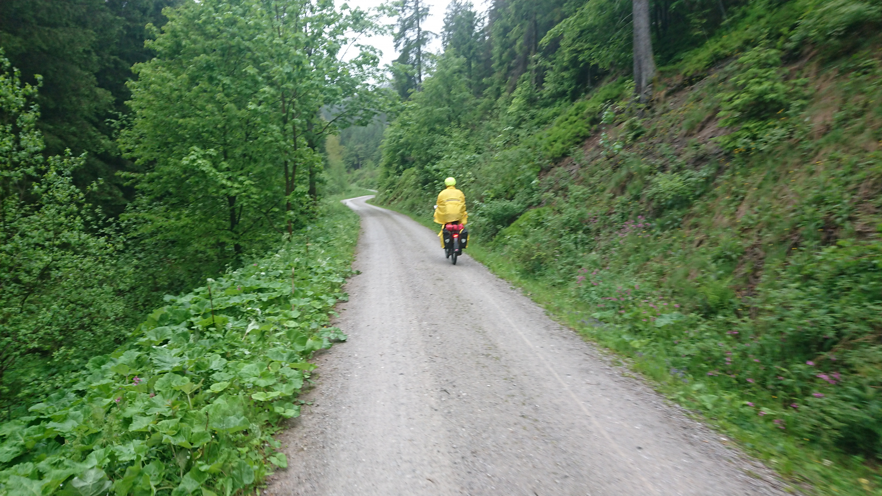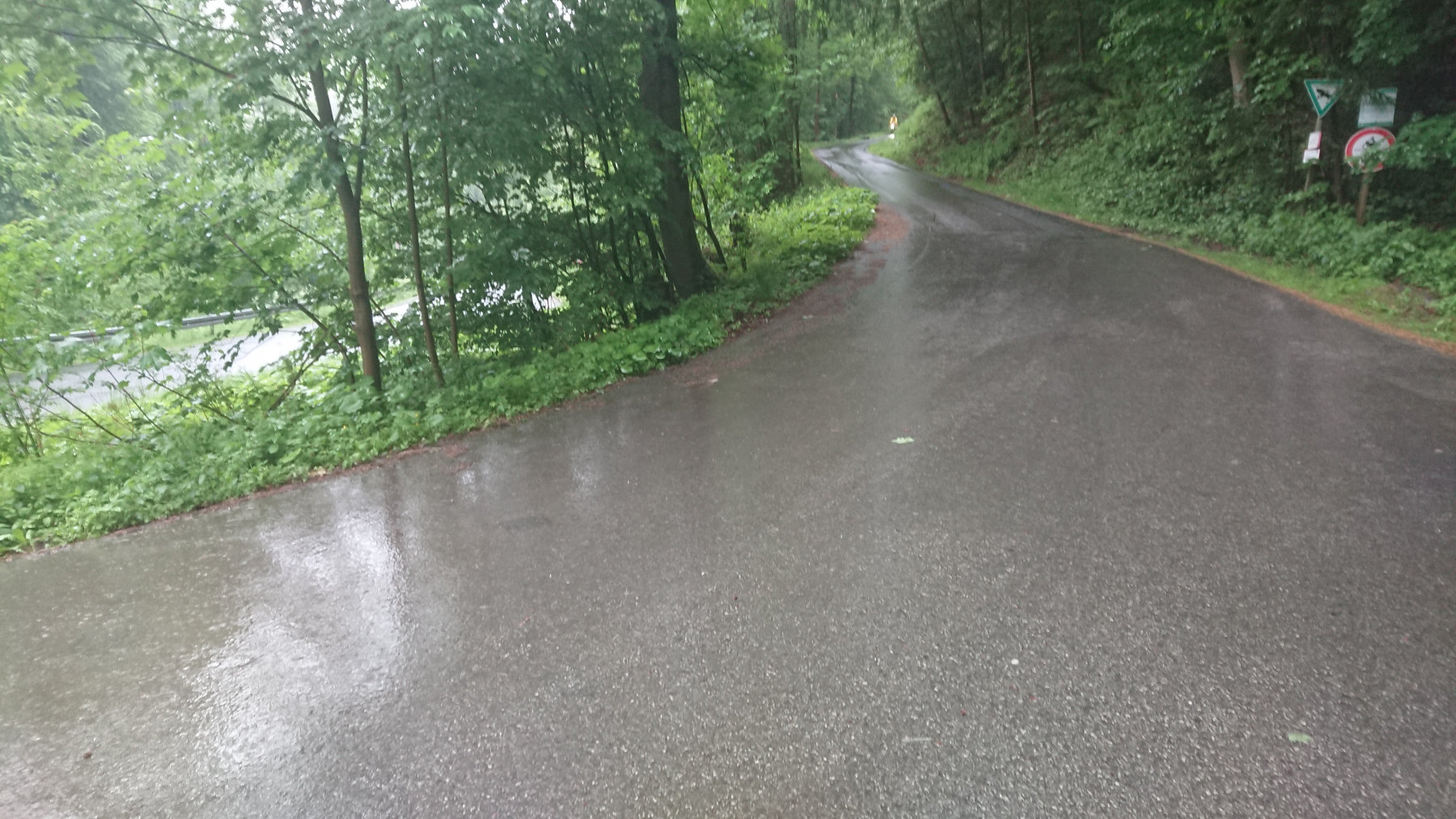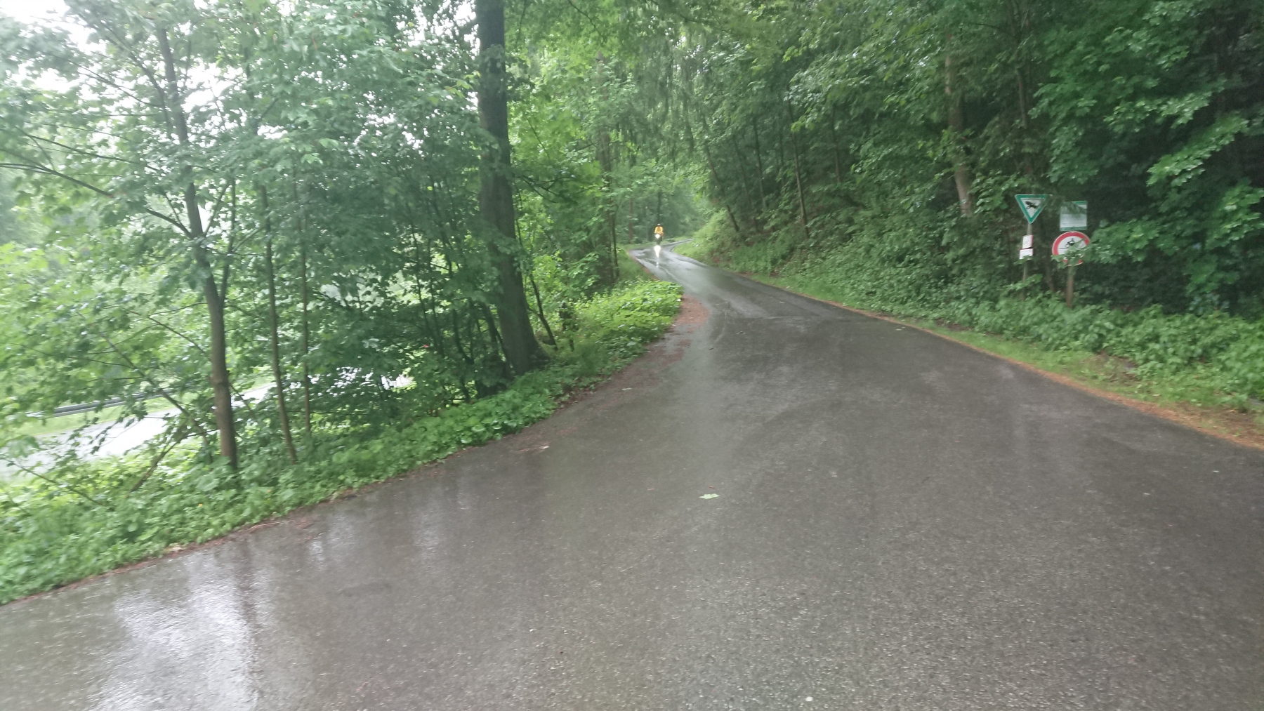 Es geht weiter bergan auf einem Schotterweg – klar wir hätten auch den weiteren Weg über die Straßen nach Bad Grund nehmen können, aber dieser Weg ist (zumindest bei Trockenheit) der schönere. Auf dem nassen Untergrund und mit bis zu 12% Steigung ist das alles andere als einfach.