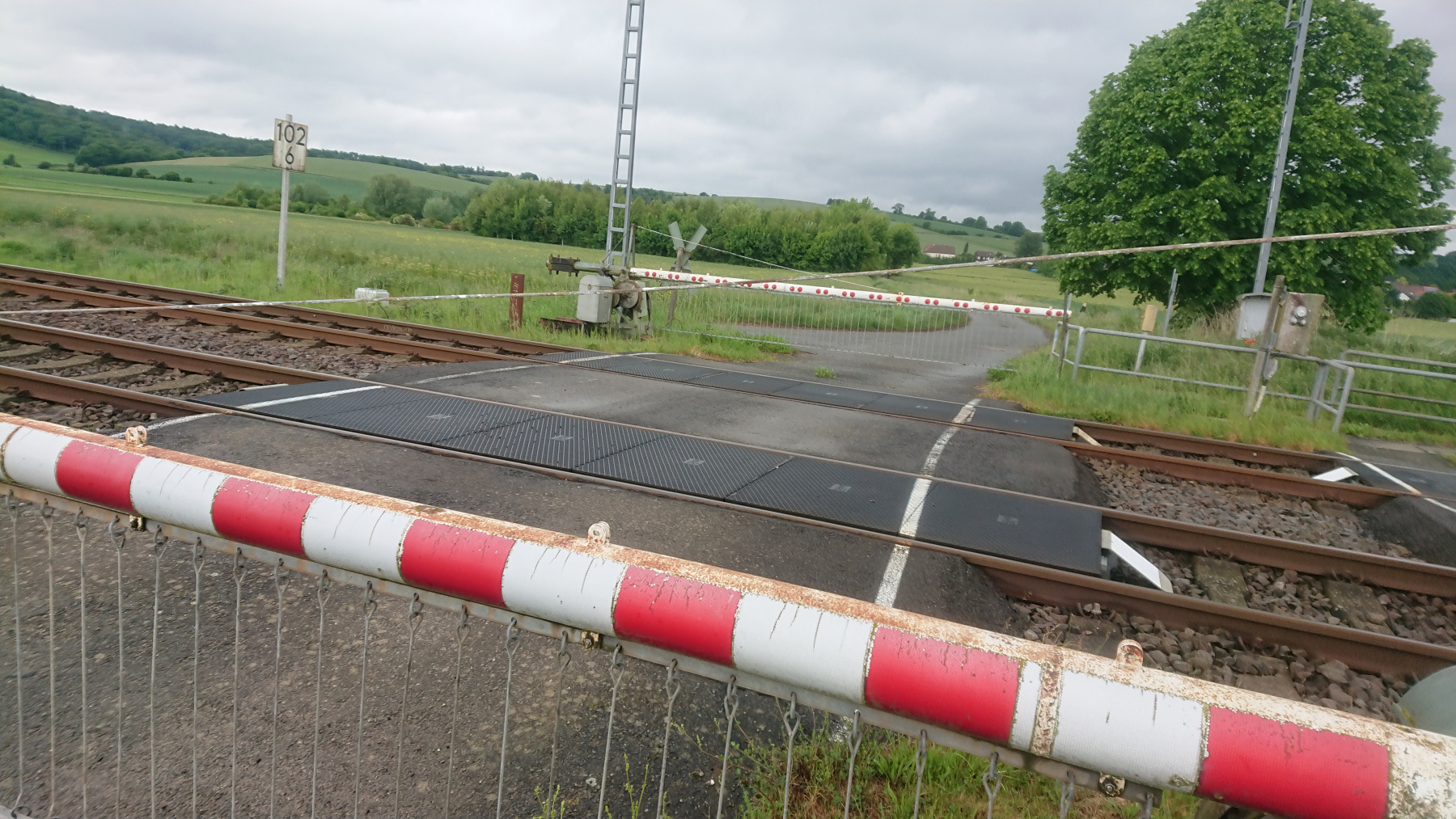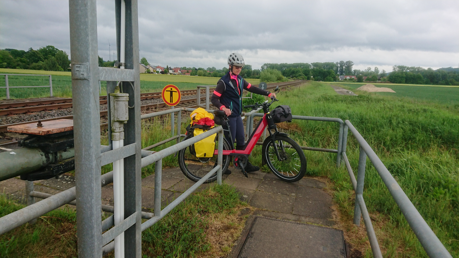 Bei Wulften sind die Bahnschranken gesschlossen. Ein Hinweisschild besagt, dass man anrufen solle, dann würden die Schranken geöffnet. Aber der Fußgängerübergang ist nicht beschrankt. Wir verzichten auf den Anruf, schauen links und rechts und queren die Bahnlinie.