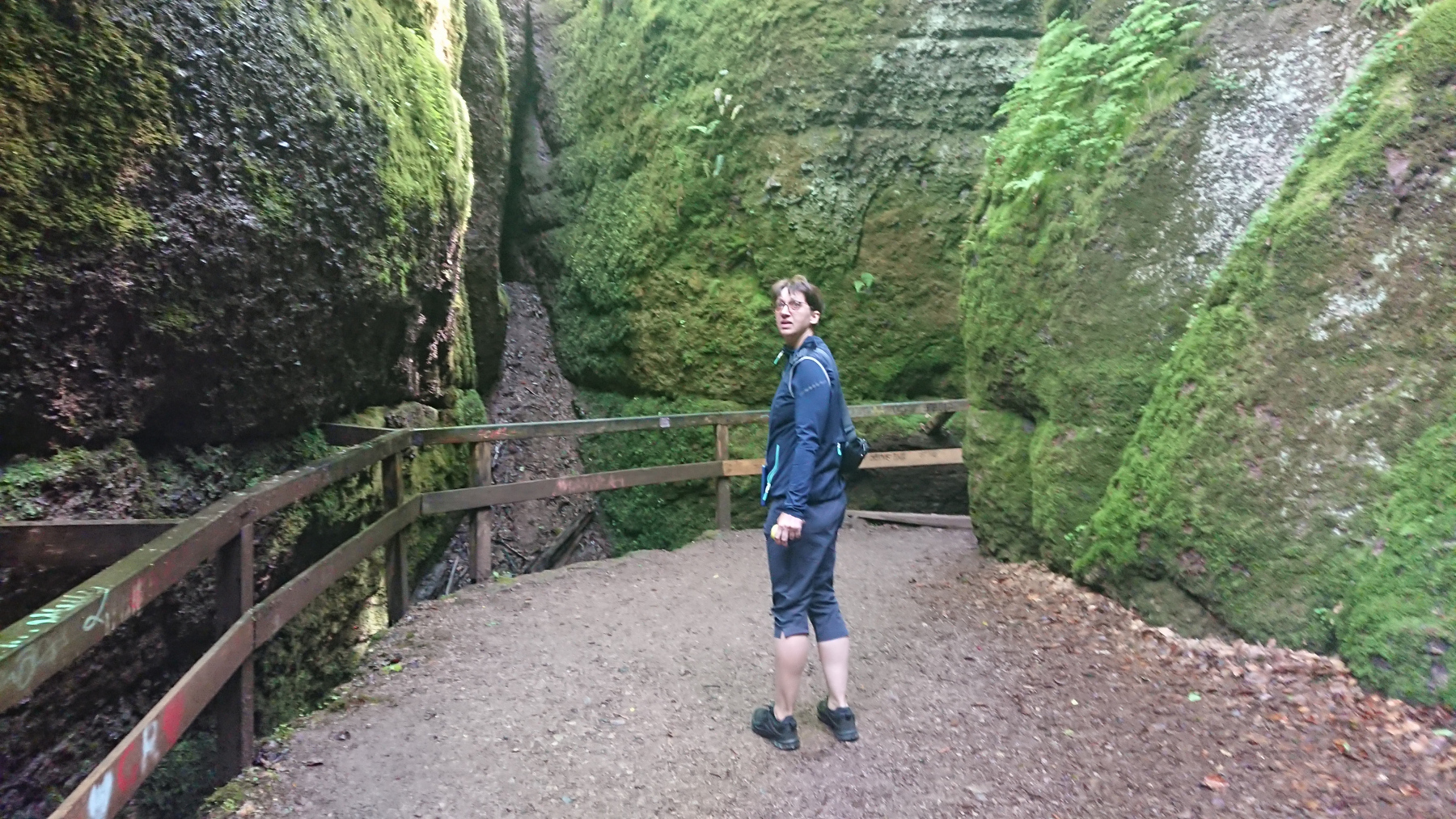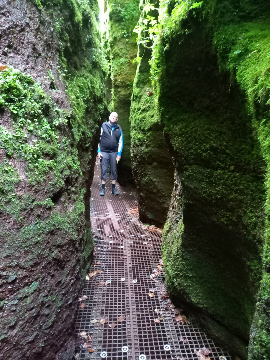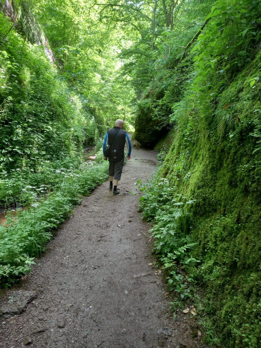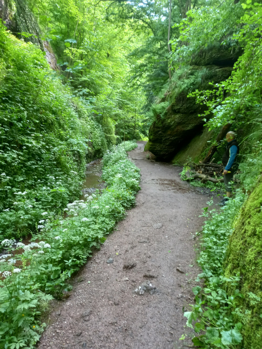 Eisenach ist schnell erreicht, wir durchqueren die Stadt und fahren rauf zur Drachenschlucht, die wir zunächst verpassen. Auf der B19 ist derart viel Verkehr und es gibt keinen Radweg, so dass die Strecke auch einem Selbstmord gleichkommt. Irgendwann kehren wir um, finden den Eingang zur Schlucht, stellen die Räder ab und gehen zu Fuß weiter.
