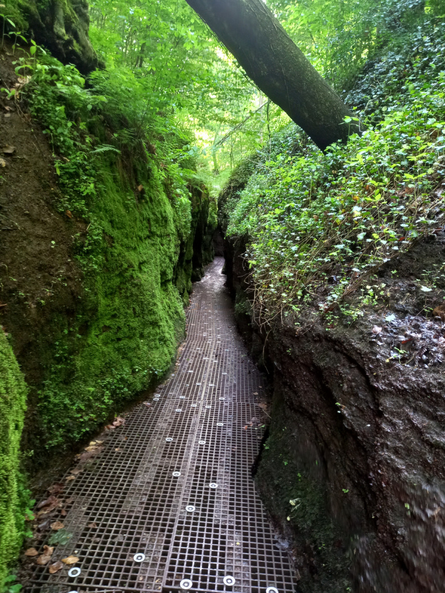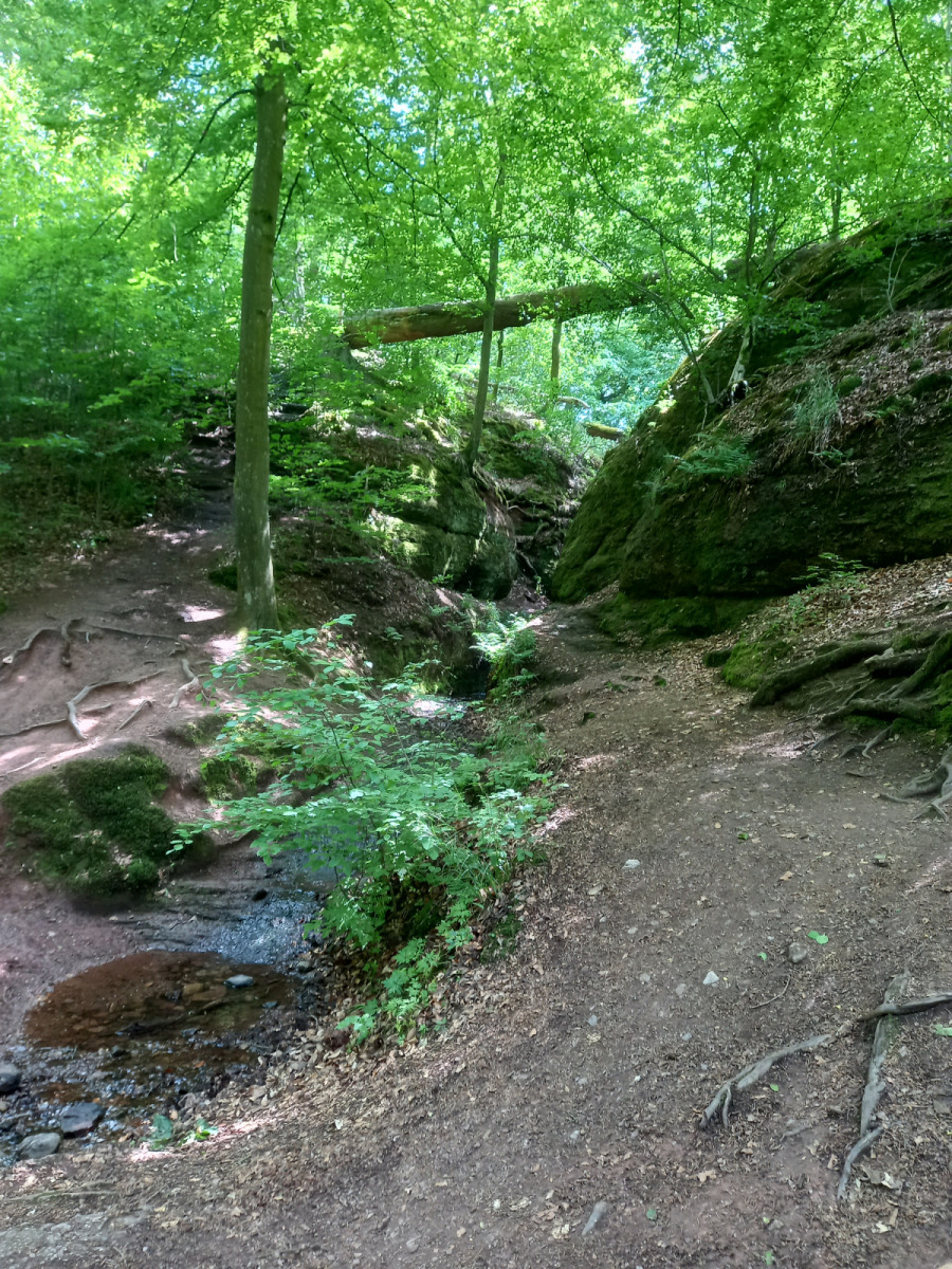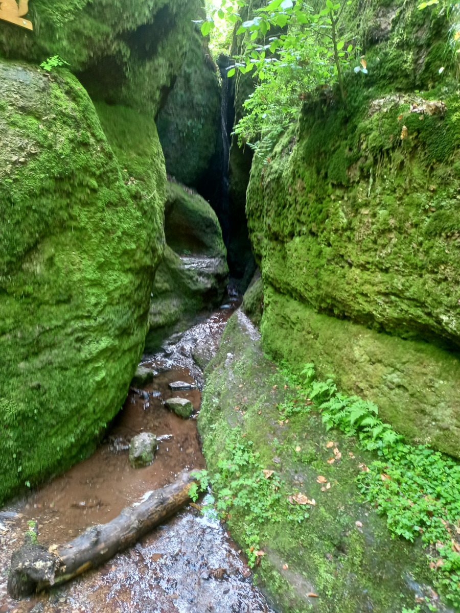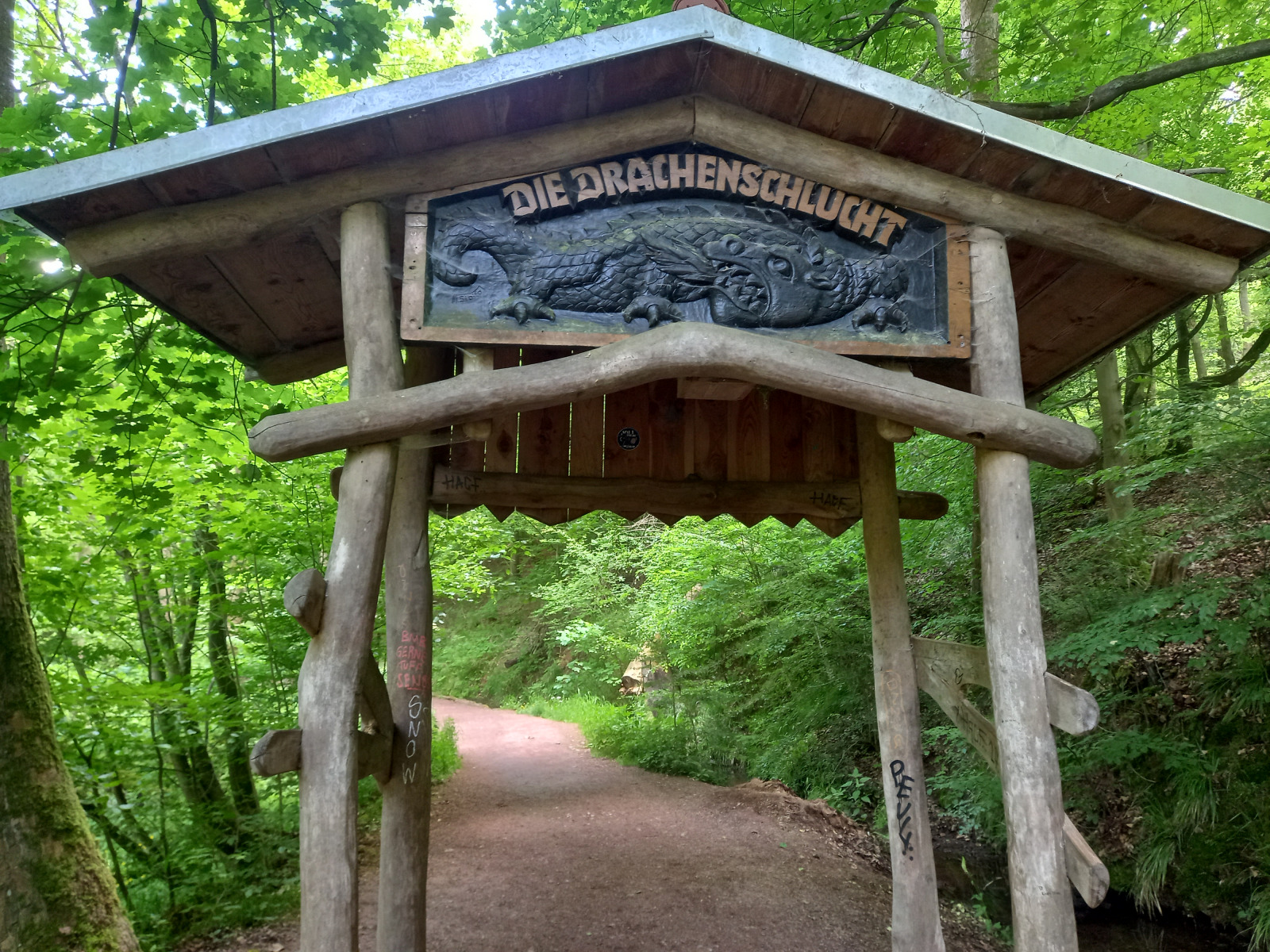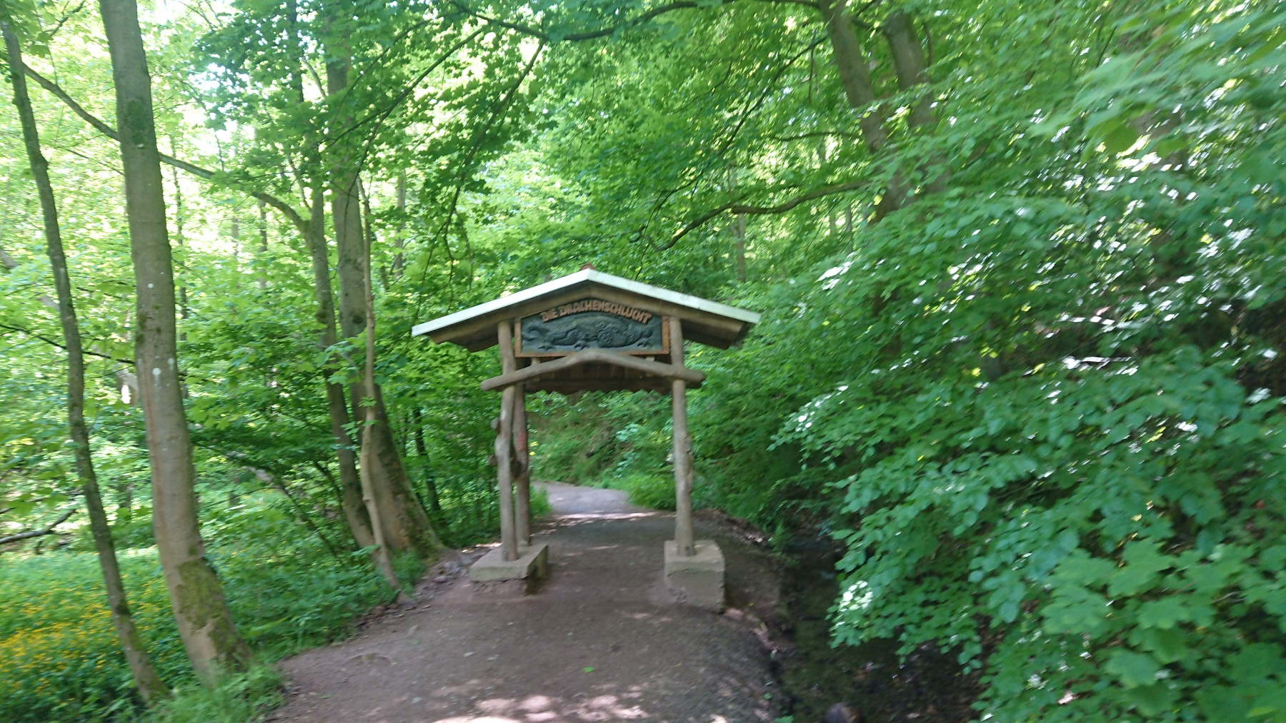 Eisenach ist schnell erreicht, wir durchqueren die Stadt und fahren rauf zur Drachenschlucht, die wir zunächst verpassen. Auf der B19 ist derart viel Verkehr und es gibt keinen Radweg, so dass die Strecke auch einem Selbstmord gleichkommt. Irgendwann kehren wir um, finden den Eingang zur Schlucht, stellen die Räder ab und gehen zu Fuß weiter.