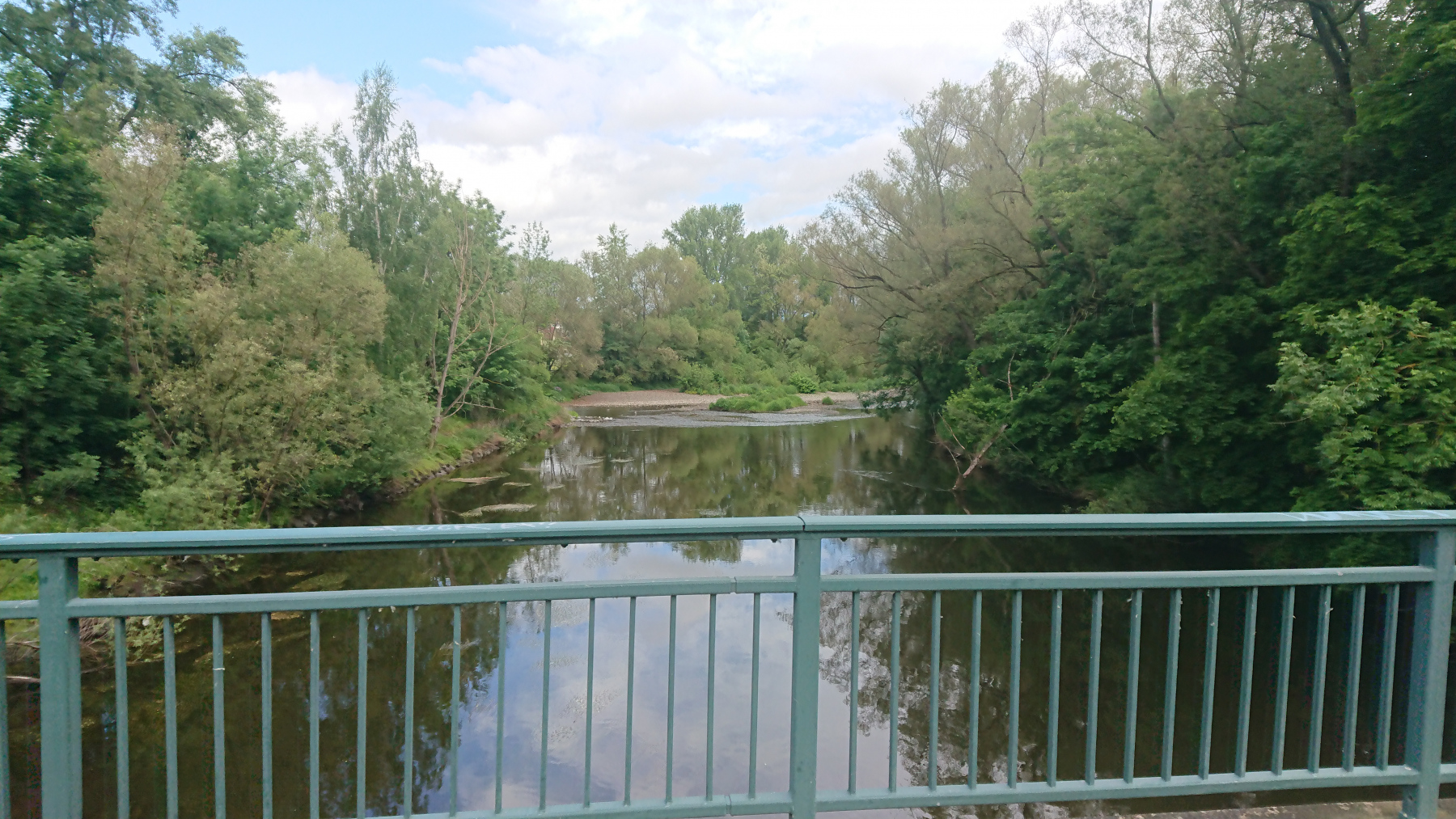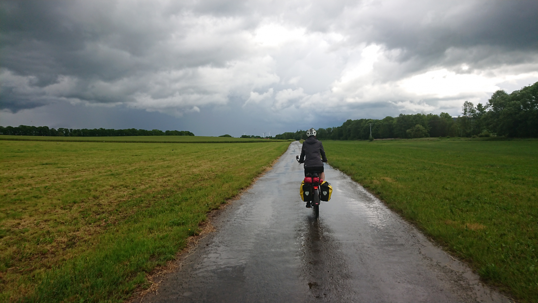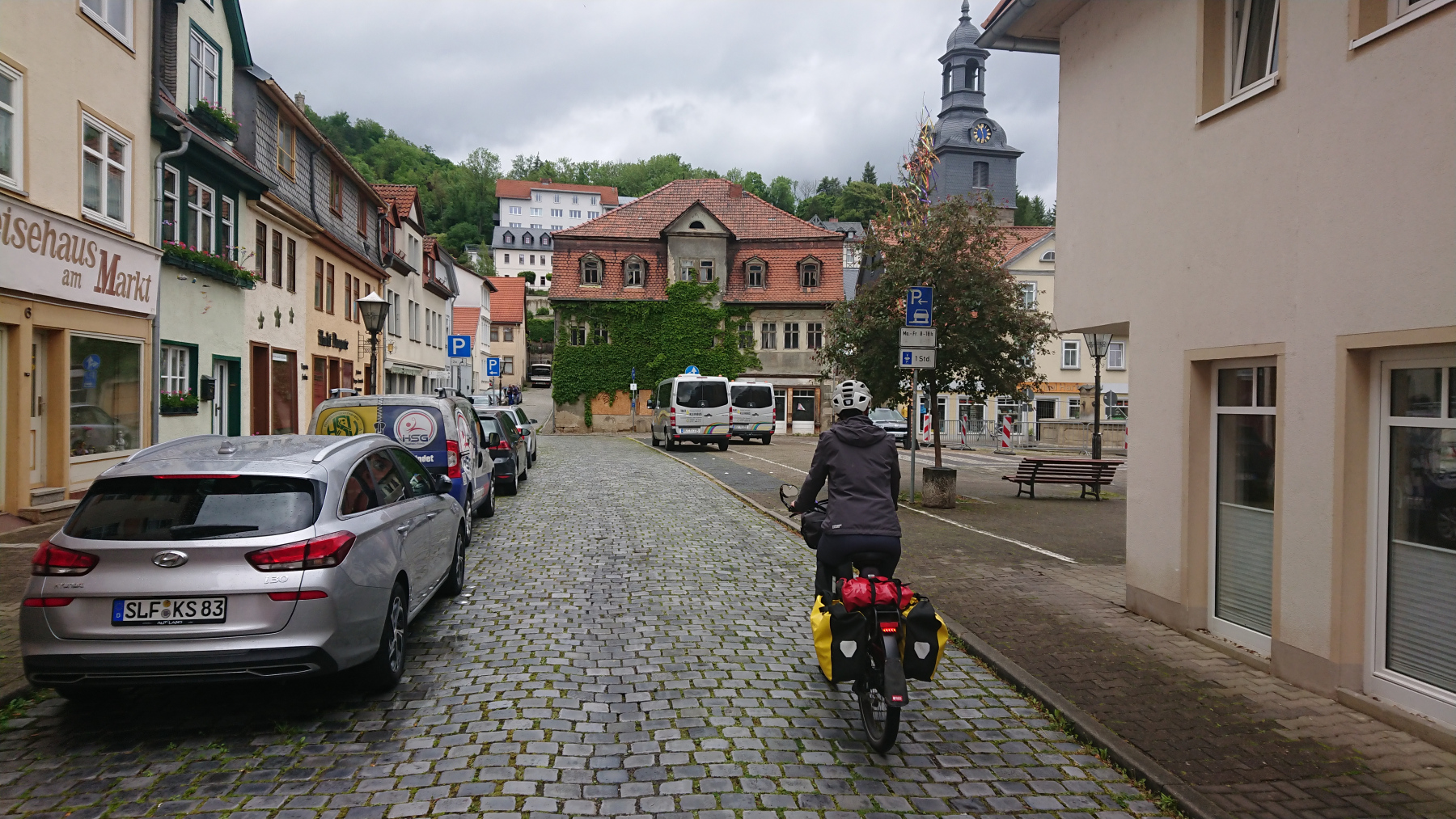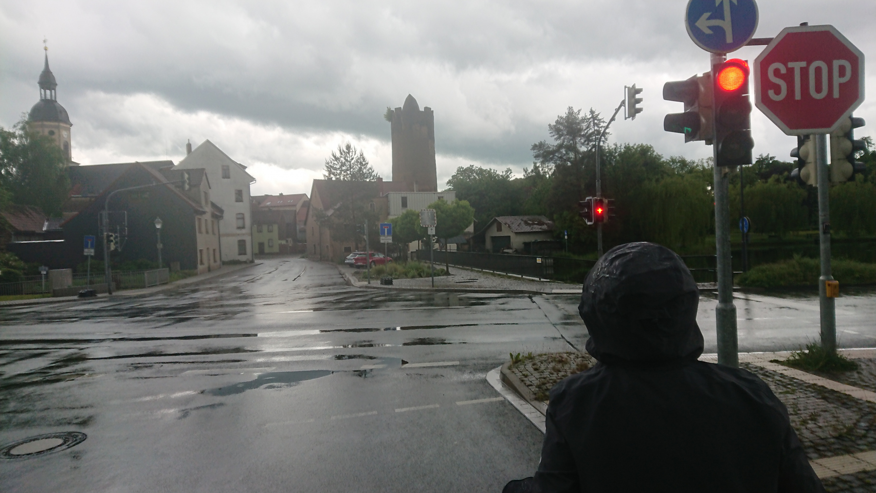 In Pößneck fallen die ersten Tropen, in Neustadt müssen wir uns unterstellen, nun geht es nur mit Regenjacke weiter. Aber die Hosen sind nass. Noch mehrmals müssen wir uns unterstellen, um dann in den Regenpausen weiter zu fahren und vom nächsten Schauer wieder in einen Unterstand gescheucht zu werden – klar, es ist nicht immer sofort eine Möglichkeit zum Unterstellen vorhanden.