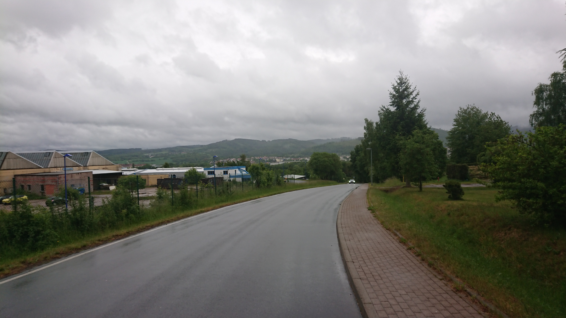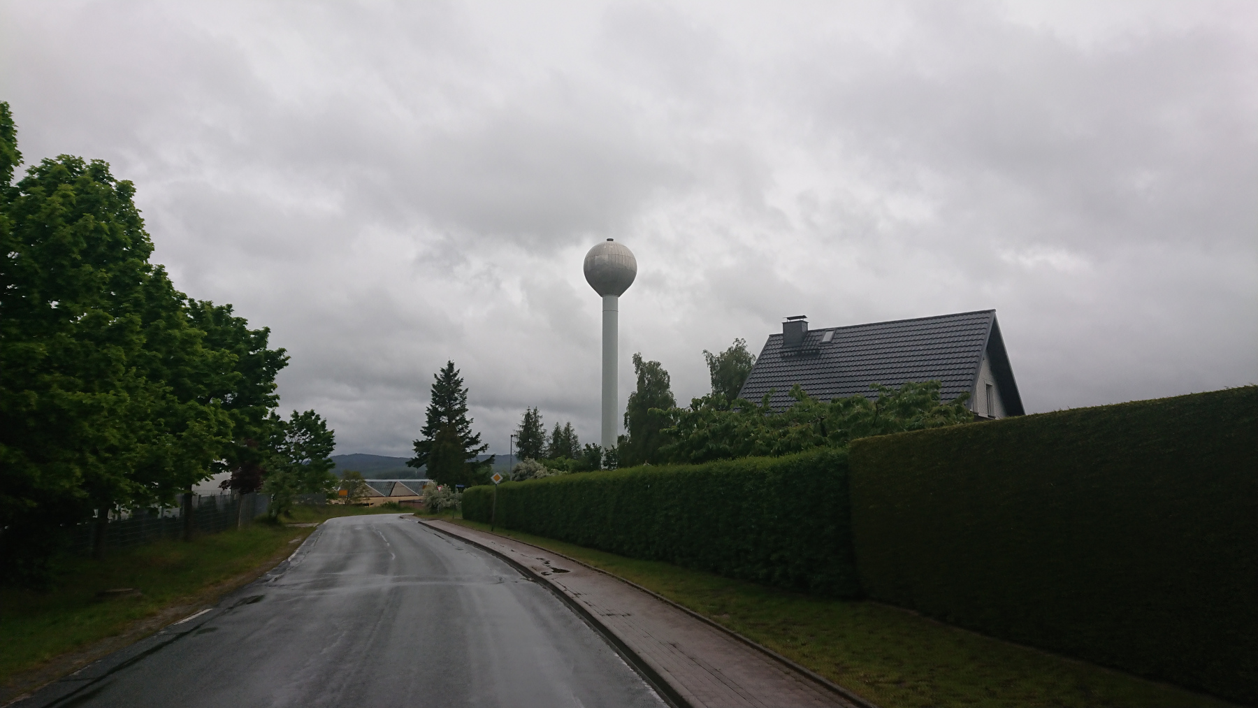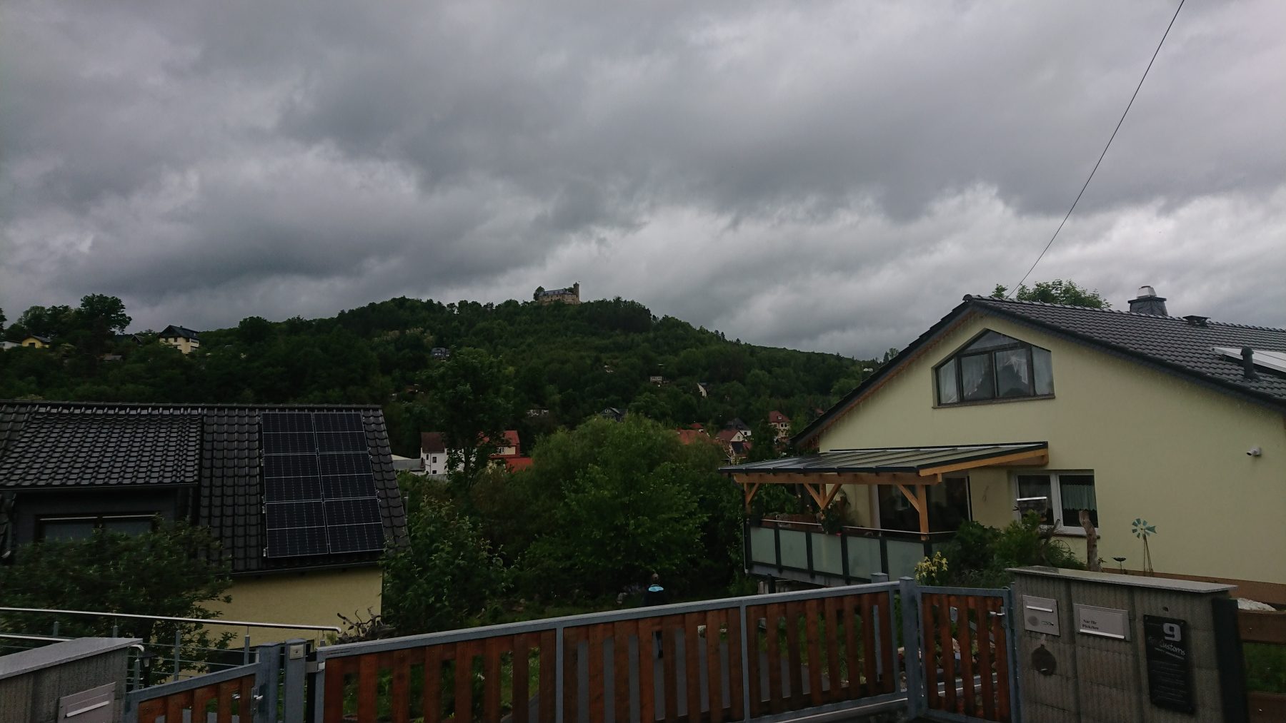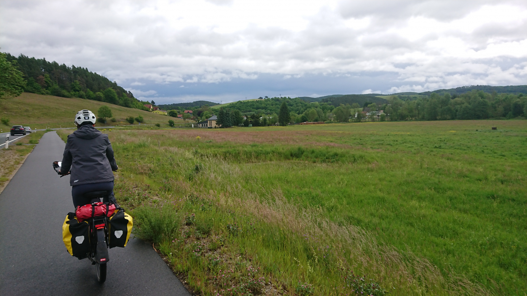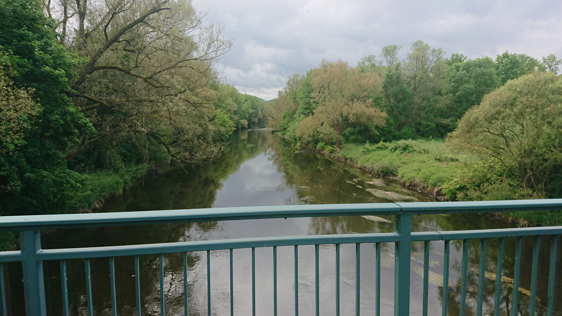 In Pößneck fallen die ersten Tropen, in Neustadt müssen wir uns unterstellen, nun geht es nur mit Regenjacke weiter. Aber die Hosen sind nass. Noch mehrmals müssen wir uns unterstellen, um dann in den Regenpausen weiter zu fahren und vom nächsten Schauer wieder in einen Unterstand gescheucht zu werden – klar, es ist nicht immer sofort eine Möglichkeit zum Unterstellen vorhanden.
