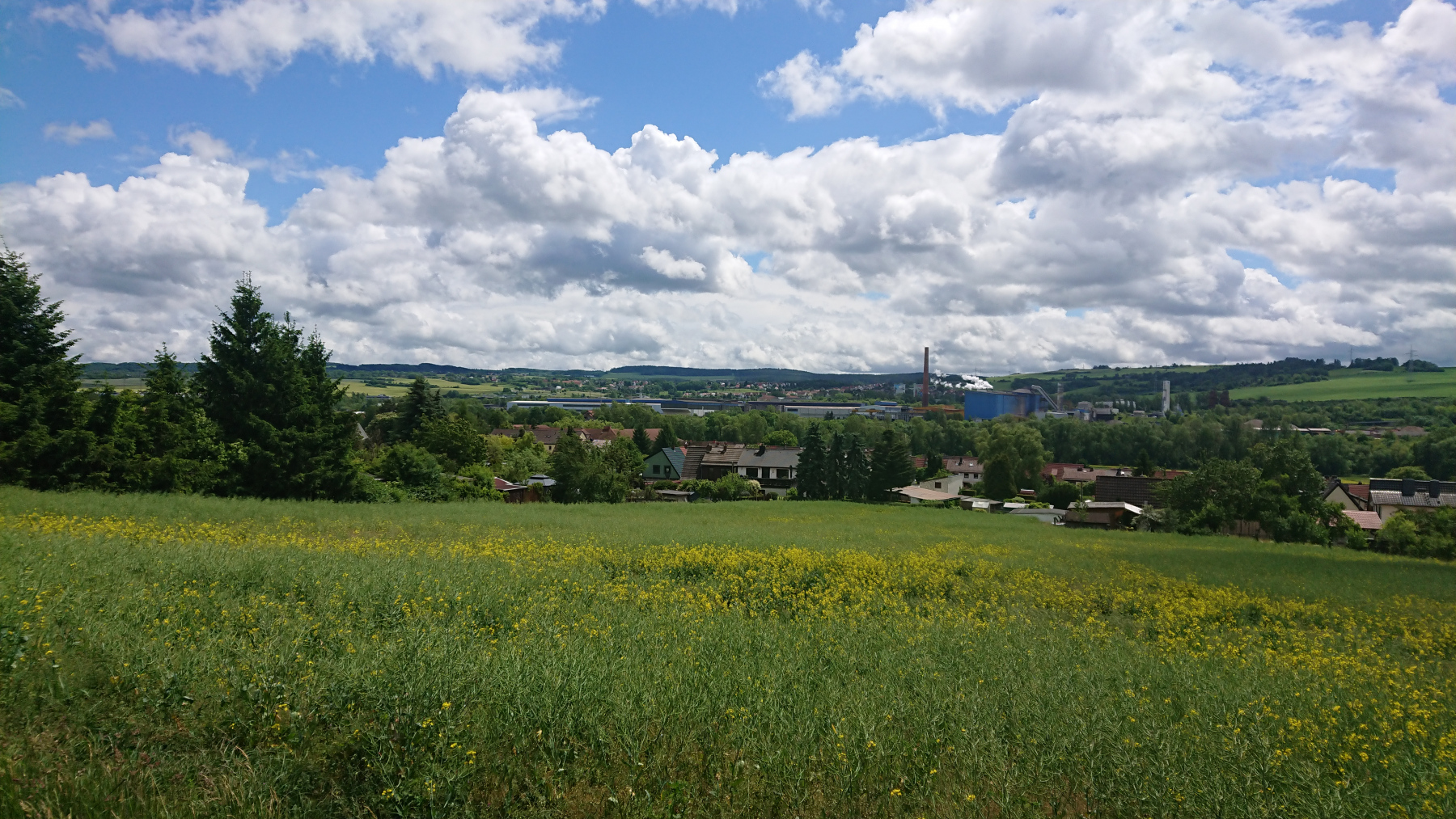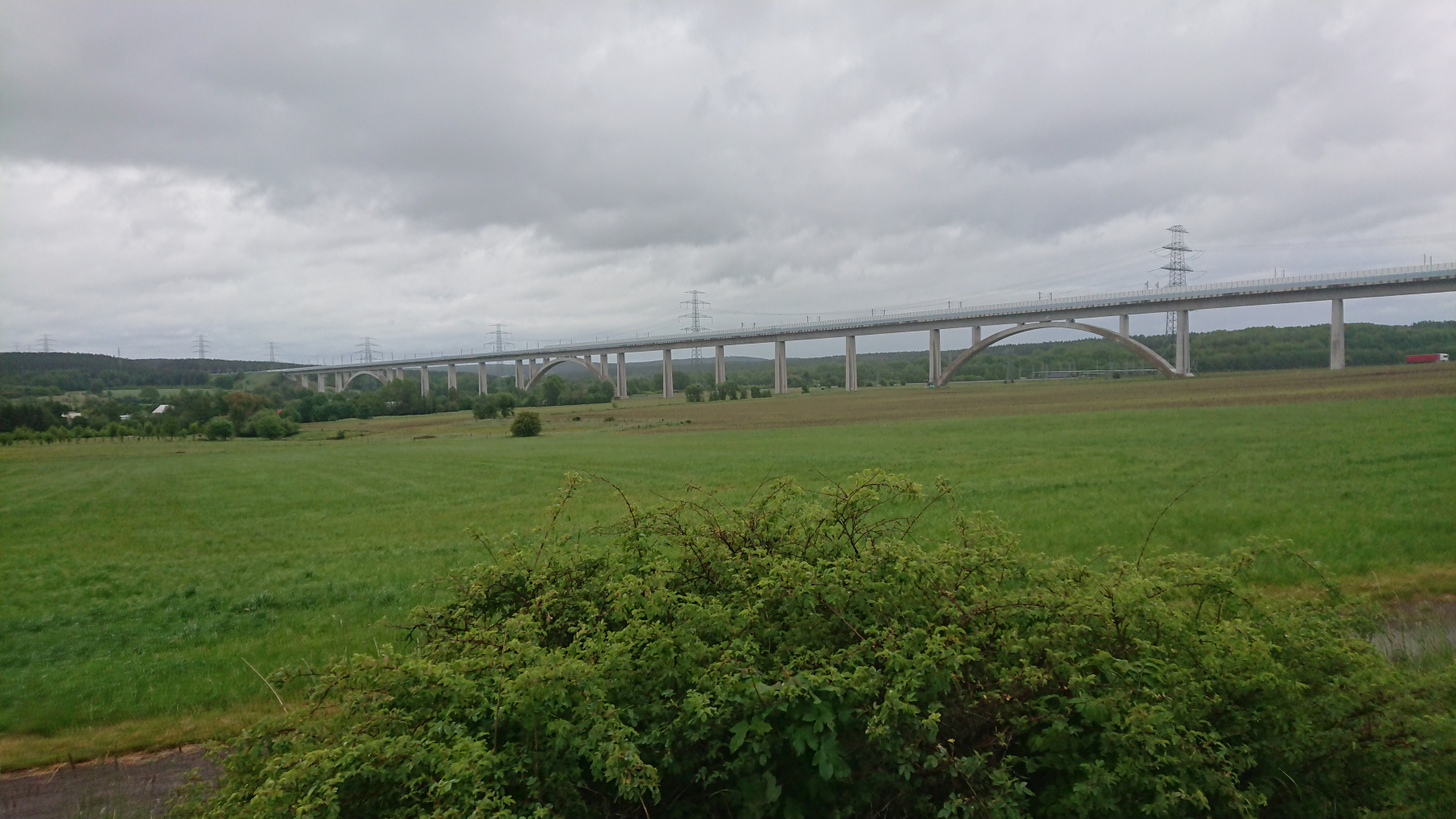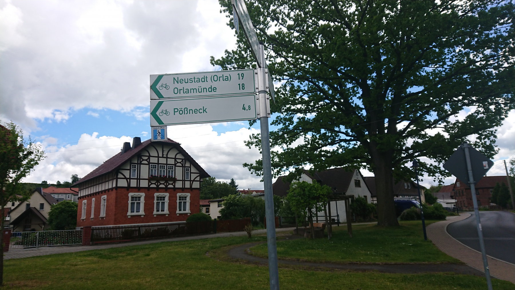 Wir verlassen Saalfeld und auch die Saale und fahren in ein Seitental ein. Auf kleinen Straßen geht es bis zur Orla bei Pößneck. In der Ferne einige hohe Gebäude, die zum Teil zum Stahlwerk Thüringen in Unterwellenborn oder vermutlich zum Großtagebau Kamsdorf gehören