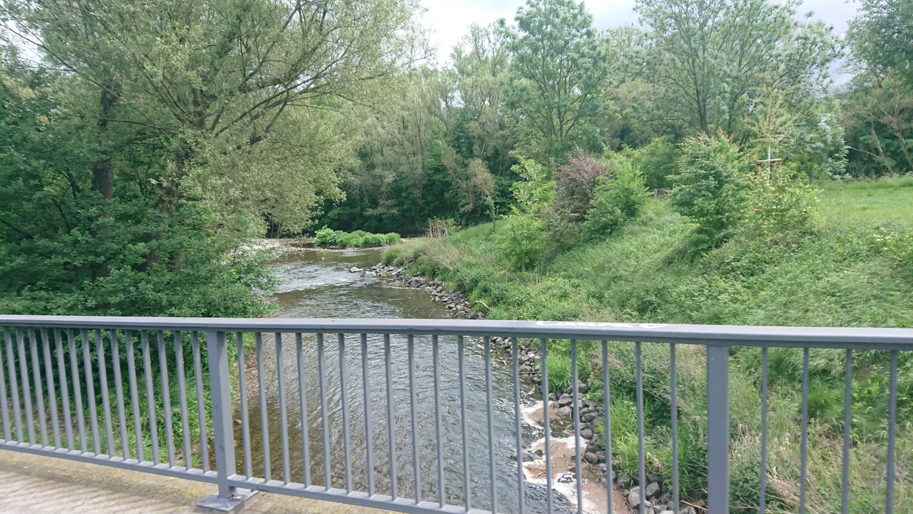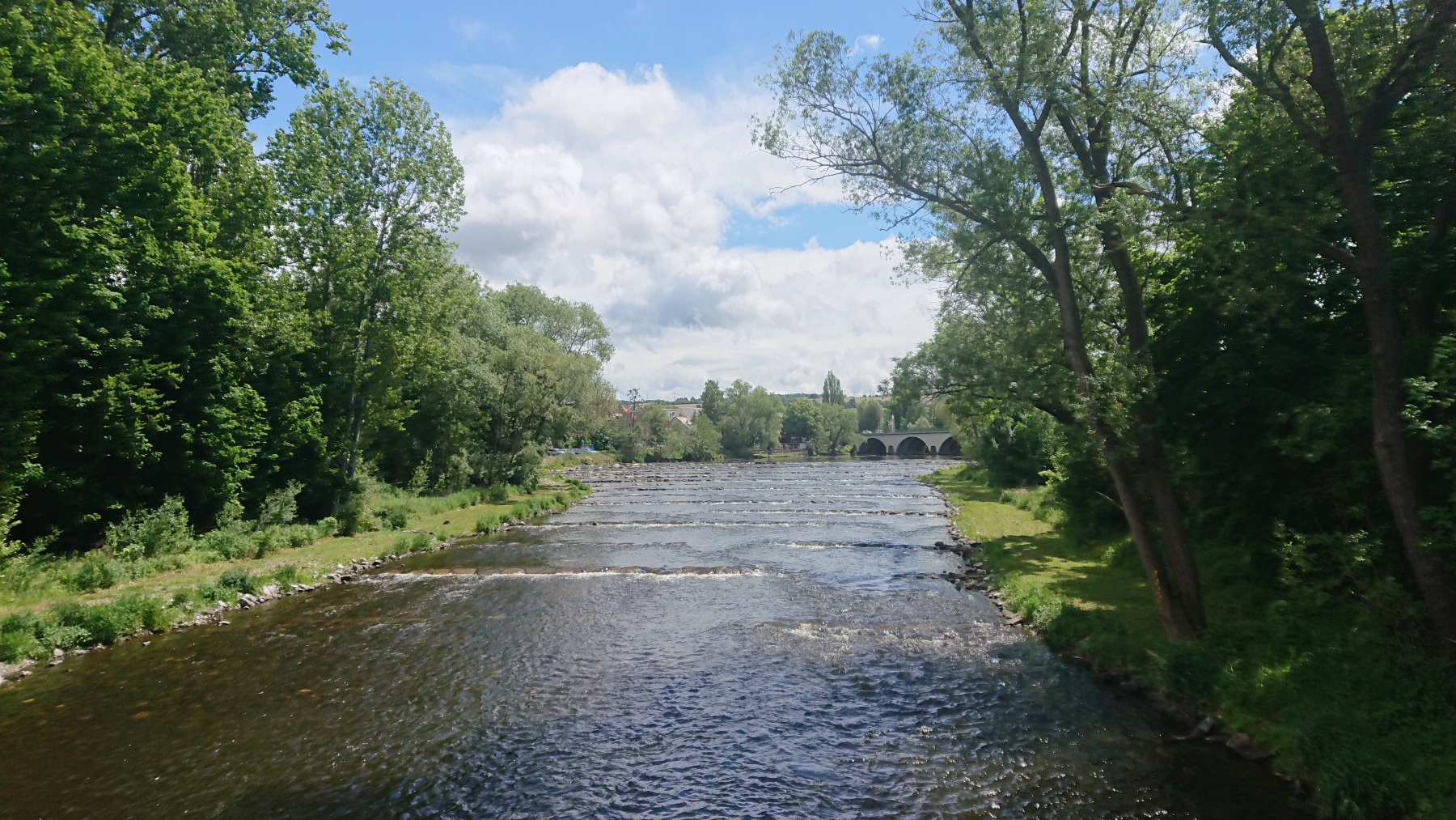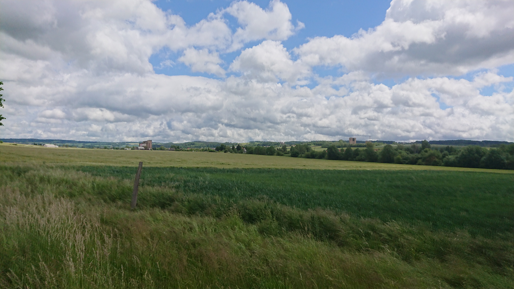 Wir verlassen Saalfeld und auch die Saale und fahren in ein Seitental ein. Auf kleinen Straßen geht es bis zur Orla bei Pößneck. In der Ferne einige hohe Gebäude, die zum Teil zum Stahlwerk Thüringen in Unterwellenborn oder vermutlich zum Großtagebau Kamsdorf gehören
