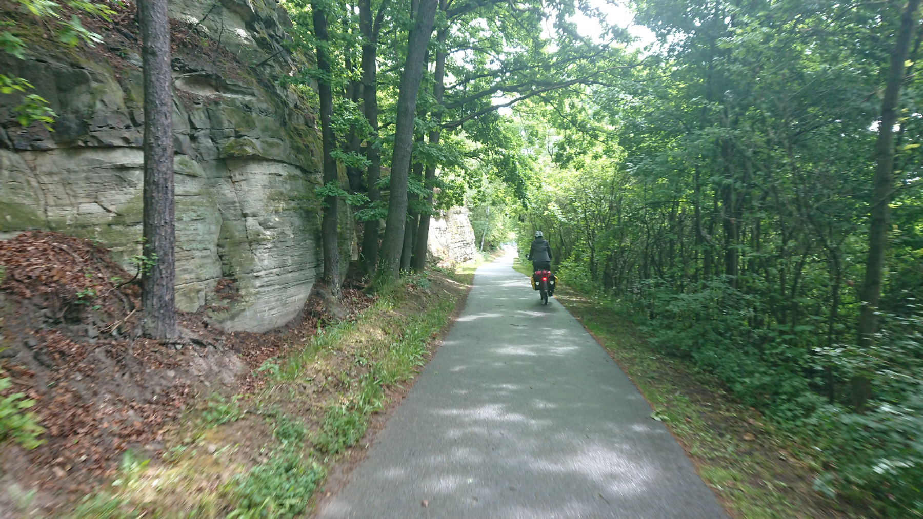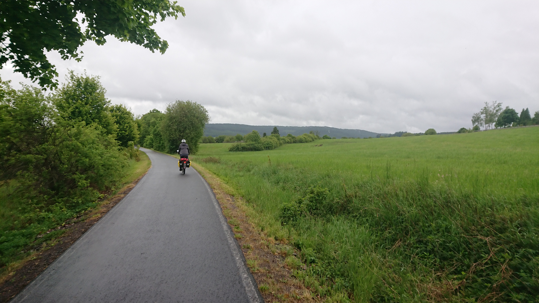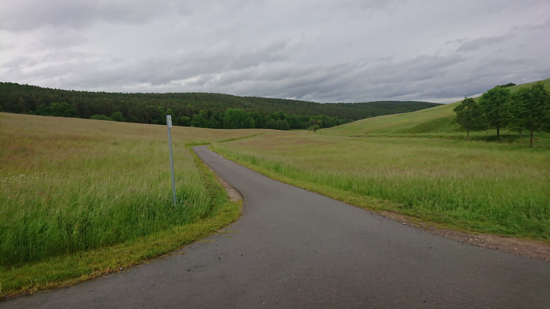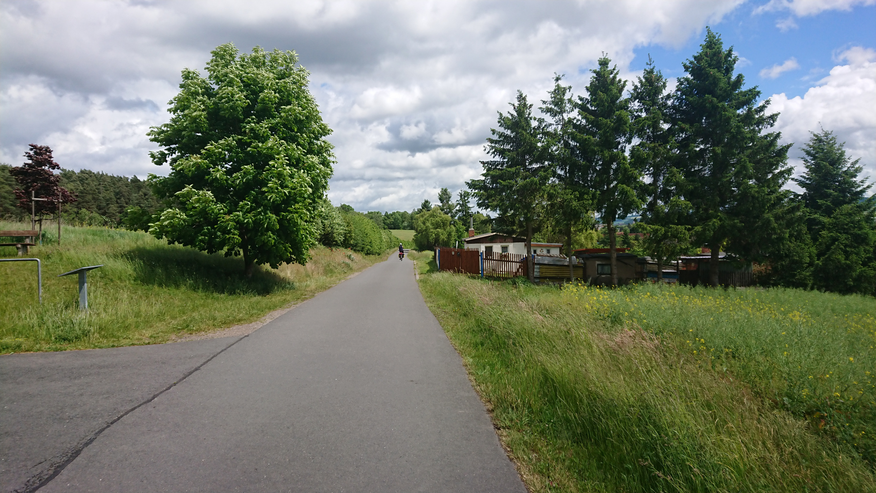 Die Waldrandroute verläuft zunächst auf einem alten Bahndamm – sehr angenehm zu fahren – oder auf kleinen Nebenstraßen ohne viel Verkehr. Und überwiegend geht es bis Saalfeld bergab von 500 runter auf etwa 200 m NN.