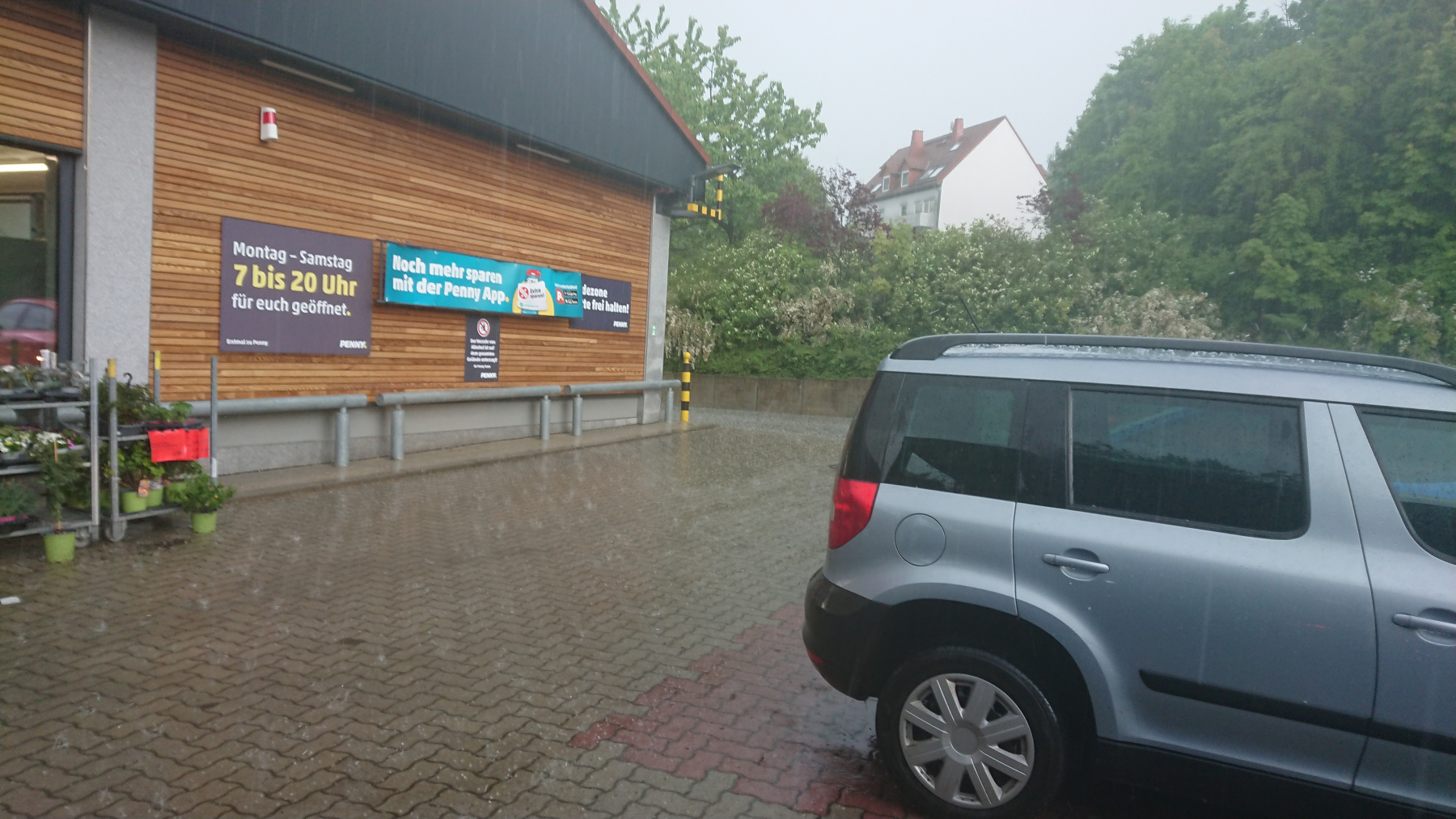 Kurz vor unserem Ziel in Auma kommt es dann noch mal richtig dicke – mitlerweile ist es egal. Hose, Schuhe, Socken sind sowieso schon naß. Platzregen – wir flüchten in einen Penny, kaufen für das Abendbrot und das morgige Frühstück ein, denn auch heute haben wir eine Zimmer, ohne Frühstück.