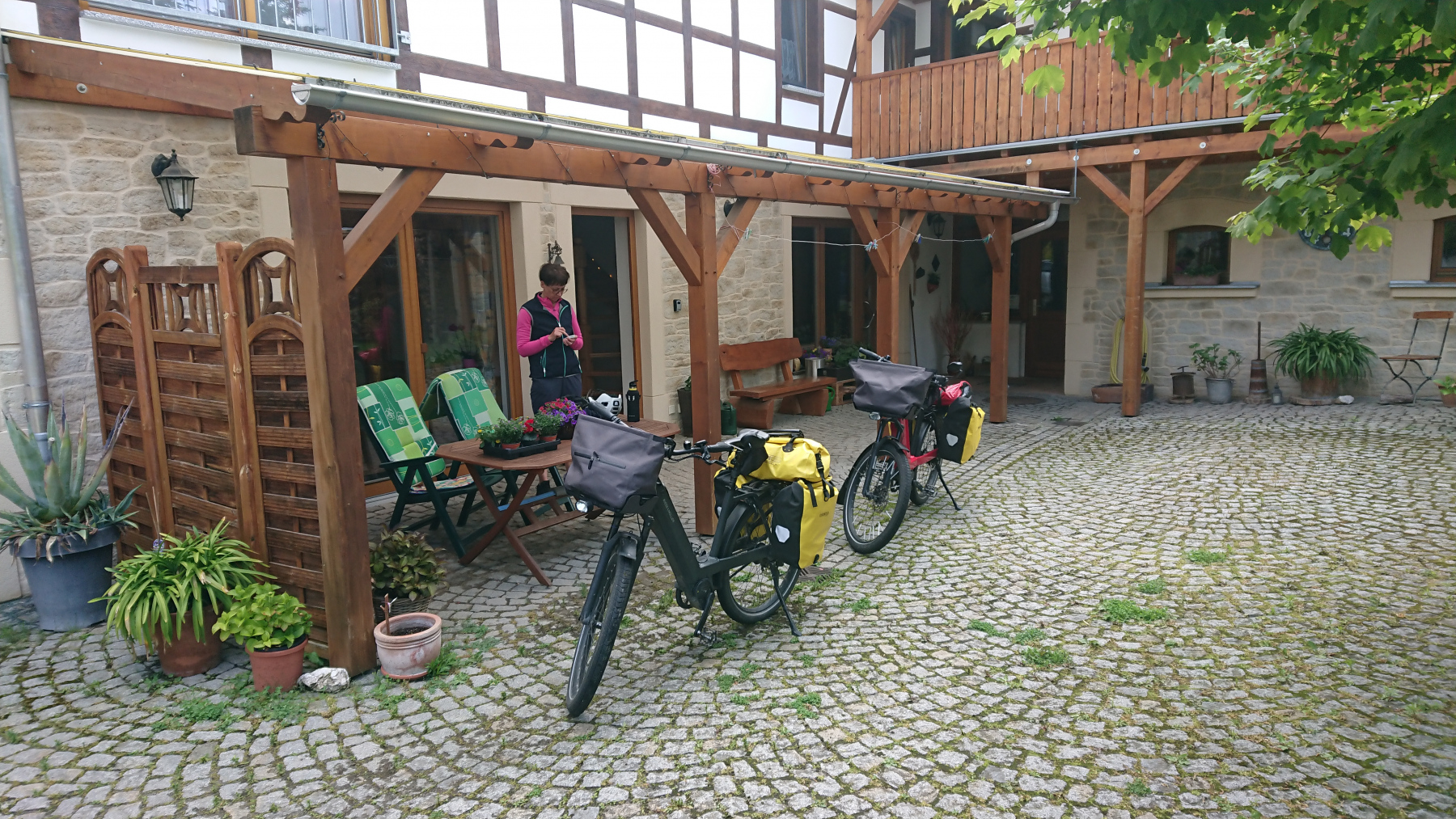 Es ist voll, aber auf Nachfrage können wir an einer Steckdose im Außenbereich rund eine Stunde unsere Akkus ein wenig aufladen. Das ist klasse. Nach gut einer Stunde und 20%-Punkte mehr im Akku und einem guten Stück Fleisch vom Grill mit Nudelsalat brechen wir wieder auf.