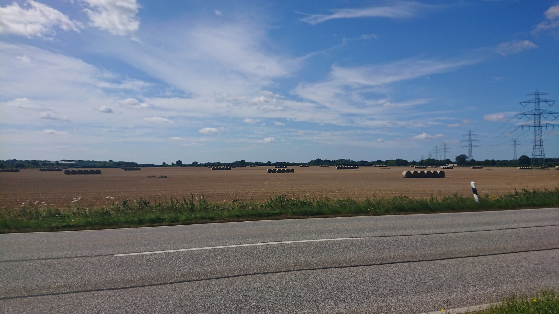 Durch die Felder geht es auf kleinen Straßen und Wegen bis an die B404 und dann paralllel zur B404 auf einem eigenen Radweg – meist hinter einer Lärmschutzwand nach Süd-Osten. Nur im Bereich der Autobahnauffahrt Schwarzenbek/Grande kommen wir an die 404 ran und müssen gegen abbiegende und abfahrende Fahrzeuge uns einen Weg auf die andere Seite bahnen. Hier ist kein Vorrag für Radfahrer – Es geht nur nach der Devise: Radfahrer seh zu, wie du selber gesund auf die andere Seite kommst.