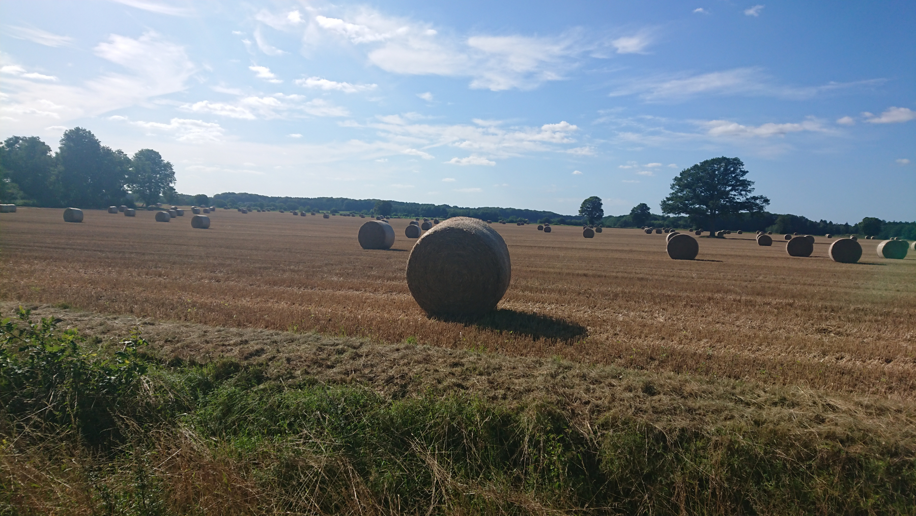 Die Landwirte nutzen nach dem Regen der letzten Wochen die Möglichkeiten Getreide. Stroh und Heu zu ernten. Und dann werden die Rundballen in Gruppen angeordnet. Immer sechs Stück – vielleicht kann der Landwirt aber auch nicht immer richtig zählen.