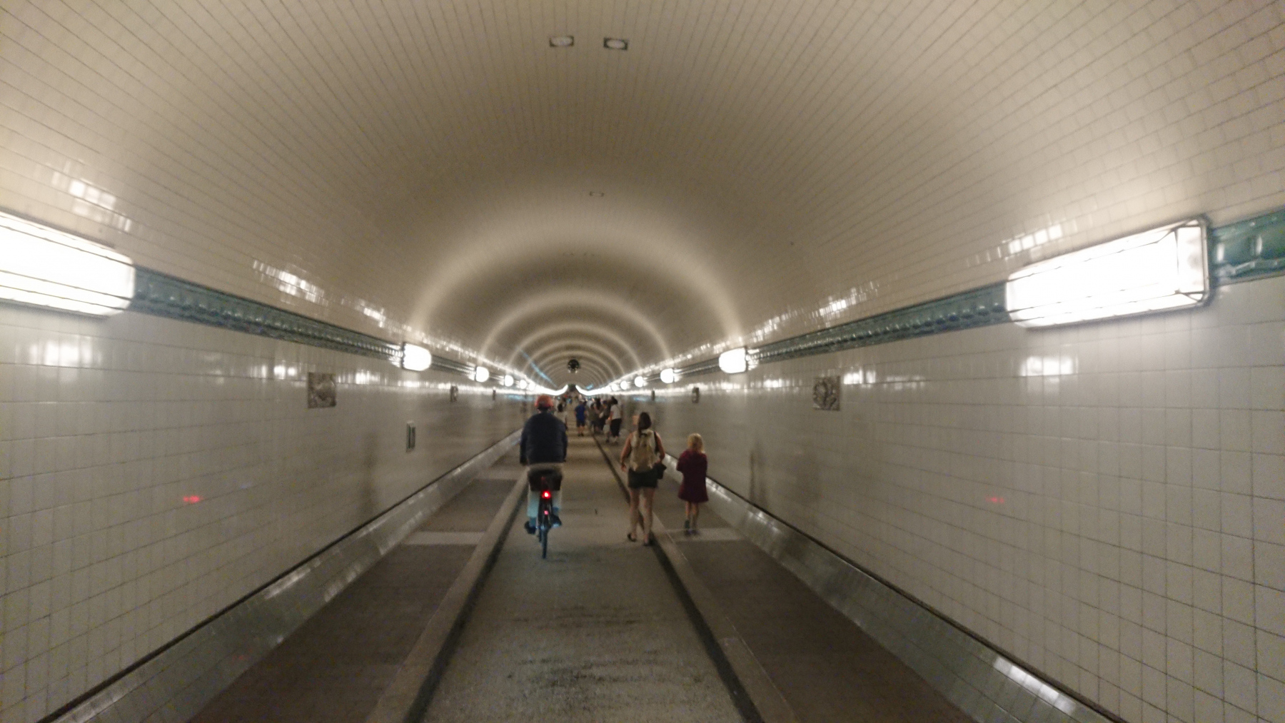 Wir radeln langsam und gemütlich unter der Elbe entlang, auf der anderen Seite geht es dann mit dem Fahrstuhl wieder nach oben.