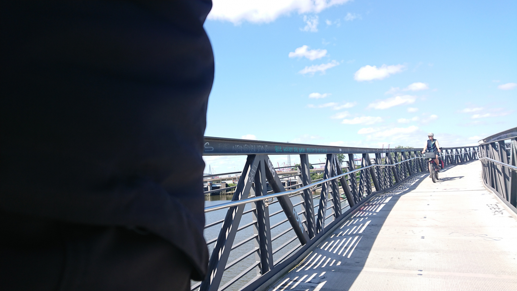 Für uns geht es durch den Hafen über Ellerholzbrücke, die Klüjenfelder Radwegbrücke und die Spreehafenbrücke nach Wilhelmsburg.