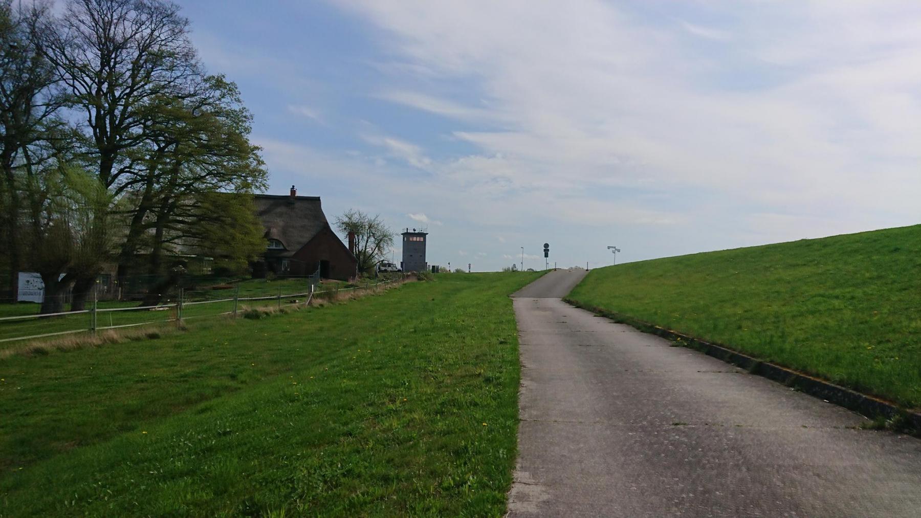 Pause auf der anderen Seite. Wir siten am Hafen, die Sonne scheint, und dann geht es auch schon zurück. Noch mal rund 40km – immer am Deich entlang, wenig aufregendes aber ein schönes Fahren. Keine Autos, aber viele Menschen mit Fahrrädern, zu Fuß, Kinder mit Rollern und und und. Zwischenzeitlich fahren wir im T-Shirt, so warm ist es geworden.